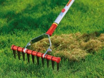 Тревата се обработва, като се изгребва няколко пъти в различни посоки: по протежение, напречно, диагонално. В същото време не се препоръчва силно натискане на греблата, за да не се повреди кореновата система на растението..