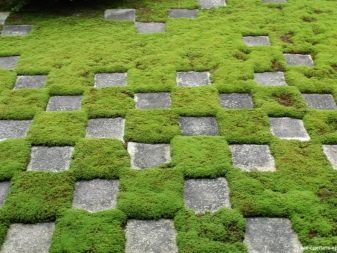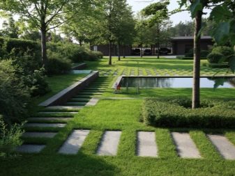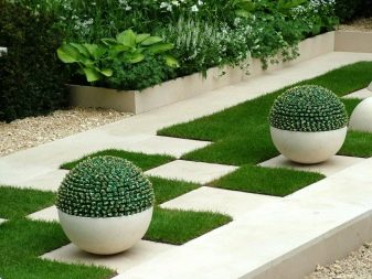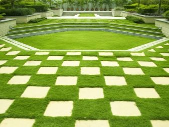 Комбинацията от тревна настилка с плочки или камък, направена в шахматна форма, изглежда необичайно. Този дизайн може да бъде допълнен с аксесоари като мраморни вази, в които също могат да се видят някои сортове растения..