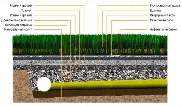 Материалът е много важен за избора на метод за закрепване на горния слой от изкуствена трева и използването на допълнителни материали..