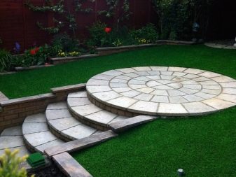 - Каменните плочки могат да се използват за създаване на шарки около зоната с изкуствена трева. Подобен щрих придава на сайта някои от характеристиките на античен дизайн..