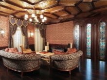 يرجى ملاحظة أنه من الأفضل عدم استخدام الخشب الباهظ الثمن في الغرف المبللة ، ولكن بالنسبة لغرفة المعيشة فهو مثالي. تتضمن العناصر المعقدة بشكل خاص في السقف قيسونات من الخشب الصلب..