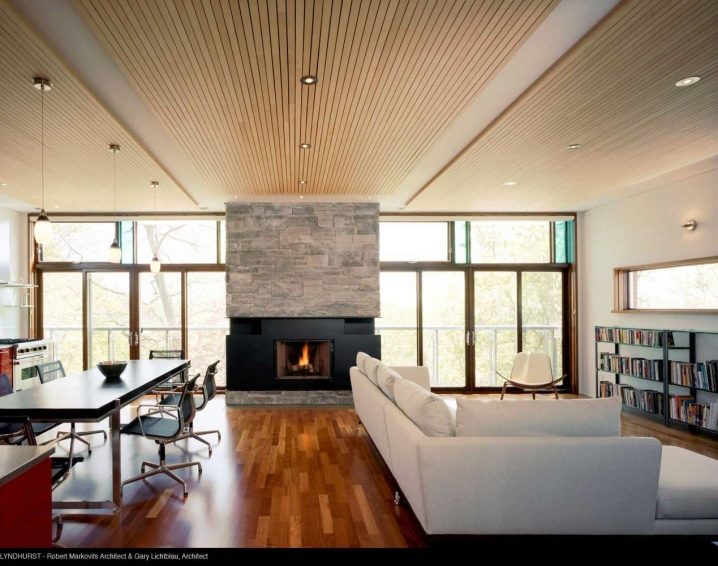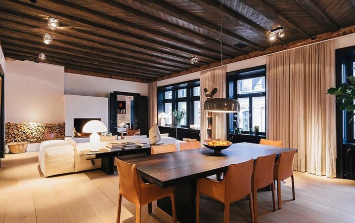 المثال الأول هو غرفة معيشة مشرقة ، منتهية بالخشب الطبيعي. كل شيء هنا طبيعي – الجدران والأرضية وبالطبع السقف. هذا المزيج من المواد يخلق جوًا لطيفًا في الغرفة ، مما يفضي إلى المتعة العائلية والاسترخاء. نظرًا لأن السقف له شكل غير عادي إلى حد ما ، فإن قاعدته تكملها عوارض معلقة. والخشب الداكن يجعل الانتقال بين مناطق تناول الطعام والجلوس أكثر سلاسة..