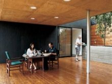 في المثال الثالث ، يتم استخدام الخشب الداكن في النهاية. يتم تطبيق نفس النوع من التشطيبات لتزيين الجدران. كل شيء يبدو عضوي جدا.