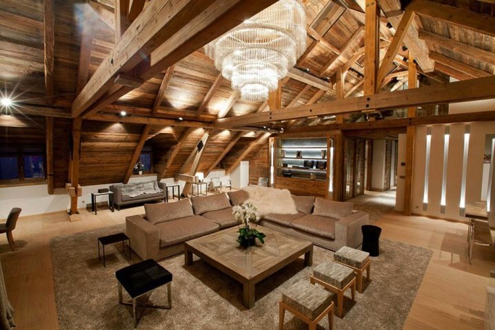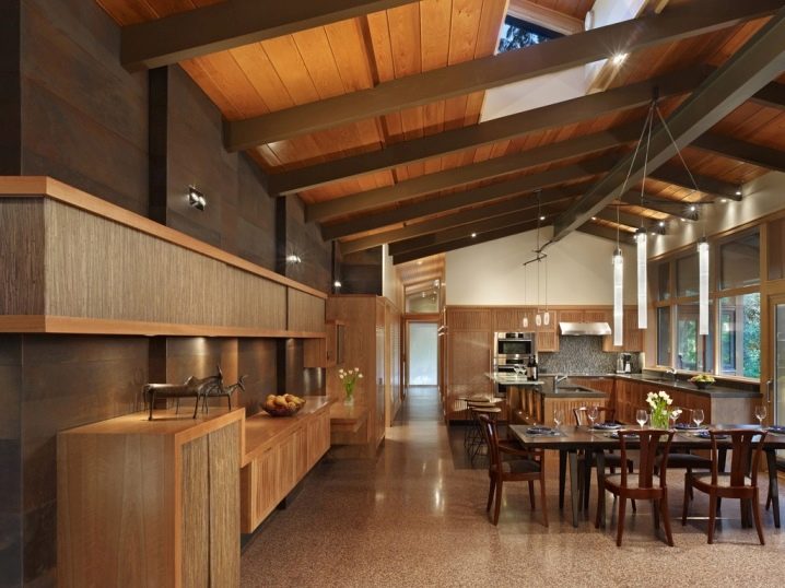المثال الأول هو غرفة معيشة مشرقة ، منتهية بالخشب الطبيعي. كل شيء هنا طبيعي – الجدران والأرضية وبالطبع السقف. هذا المزيج من المواد يخلق جوًا لطيفًا في الغرفة ، مما يفضي إلى المتعة العائلية والاسترخاء. نظرًا لأن السقف له شكل غير عادي إلى حد ما ، فإن قاعدته تكملها عوارض معلقة. والخشب الداكن يجعل الانتقال بين مناطق تناول الطعام والجلوس أكثر سلاسة..