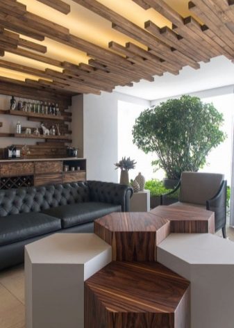 - التفرد. وأخيرًا ، لا يسع المرء إلا أن يلاحظ المظهر الأصلي والجذاب. الخشب مادة جميلة في حد ذاتها بسبب قوامها وأنماطها على سطحها. هذا هو السبب في أن الأسقف الخشبية لم تعد بحاجة إلى أي معالجة إضافية أو بالورنيش..
