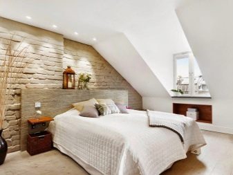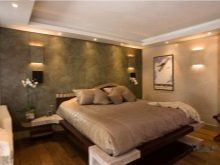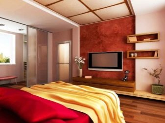 تم الحصول على التصميم الفريد للغرفة هنا بسبب تقسيم الغرفة باستخدام الجص من مواد وألوان مختلفة. على سبيل المثال ، تم تزيين المنطقة الوظيفية المقابلة للسرير بمادة ذات لون مغرة ، والتي تتباين في مقابلها لوحة بلازما سوداء وحجر رصيف أبيض..