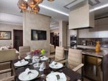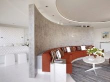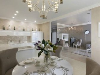 في الشقق التي يتم فيها دمج المطبخ مع غرفة المعيشة أو غرفة المعيشة مع الردهة ، من المعتاد تحويل غرفتين إلى غرفة واحدة كبيرة بمساعدة تصميم واحد بنفس الجص. الشيء الرئيسي هو عدم نسيان أن المطبخ يخضع لتكوين متزايد للرطوبة والبخار ، وبالتالي ، كما هو الحال في غرفة المعيشة جنبا إلى جنب معها., من الأفضل استخدام مواد ذات تأثير كاره للماء.