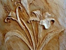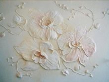 - خصص الجبس الزخرفي لعمل أنماط حجمية, على سبيل المثال ، الورود ، حيث يتم الحصول على البتلات من خلال وضع المادة من خلال كيس بلاستيكي مجعد على طول خطوط الاستنسل المطبوع مسبقًا على الحائط. في أغلب الأحيان ، يتم وضع الرسومات على خلفية بيضاء لقاعدة الجص ، وعندها فقط يتم رسم الأجزاء البارزة بشكل إضافي في الظل المطلوب لجعل الزهرة طبيعية..