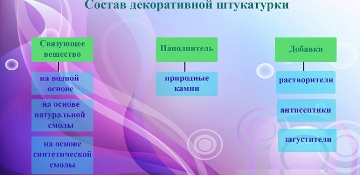 عادة ما تكون المواد الفعالة الرئيسية في الجبس هي مركبات الأسمنت والطين والجبس ، وكذلك المعادن المختلفة. إذا كانت المادة مصنوعة على أساس بوليمر ، فإن العناصر المقيدة الرئيسية هي راتنجات السيليكات أو الأكريليك ، بالإضافة إلى العديد من الحشوات المركبة الاصطناعية.