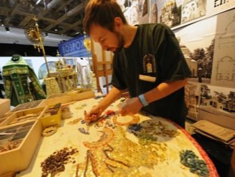 على الأشياء المعدة ، يتم وضع العلامات وقطع الأجزاء على الماكينة. يصل سمك الألواح النهائية إلى 2-3 مم. يتم صقل الأجزاء على آلة طحن الجزء. الطريقة العكسية لتجميع اللوحة هي وضع العناصر مقلوبة باستخدام الإستنسل. القاعدة المجمعة مثبتة بالغراء من الجانب السيئ. تستخدم هذه الطريقة في العمل الجماعي. اللمسة الأخيرة هي صنفرة السطح النهائي.