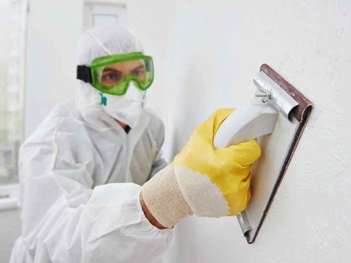 - من الضروري وضع المعجون في الملابس الواقية والقناع أو جهاز التنفس الصناعي ، لأنه من أي حركة غير مبالية ، يمكن لطائرة ذات تركيبة كاوية إلى حد ما ، تدفع عن الجدار ، أن تدخل العين أو الجهاز التنفسي.