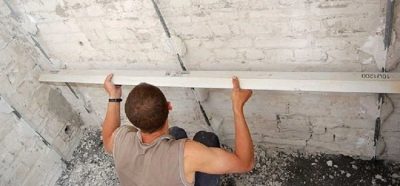 في هذا الخيار ، لتسوية التركيبة على السطح ، من الأفضل استخدام القاعدة – سكة من الألومنيوم ، بطول 1-3 أمتار. يتم وضع المعجون على الحائط بين المنارات ويتم تنفيذه كقاعدة عامة بالضغط عليه بإحكام على قضبان المنارة.