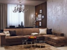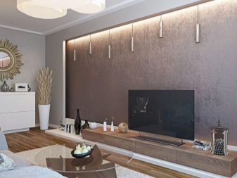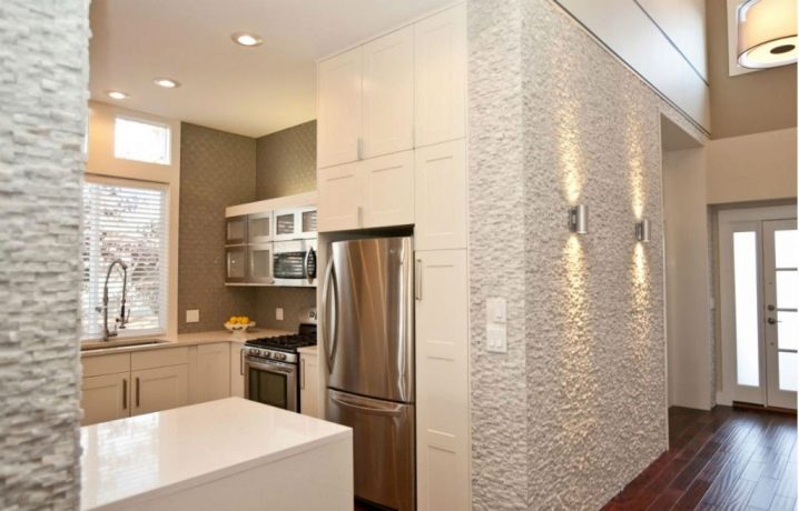 يمكن وضع الجبس الرمادي الفاتح ، الذي يقلد هيكل الحجر ، في غرفة المعيشة على الحائط خلف منطقة الجلوس. قبل هذه النهاية ، ستبدو الأريكة الجلدية البيضاء وطاولة القهوة الداكنة رائعة..