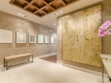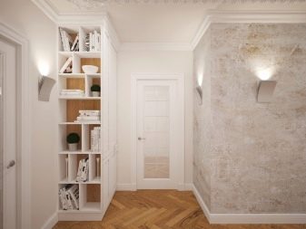 سيكون الجص المنقوش بظل حليبي إضافة رائعة للممر. يجب تعليق المصابيح المعدنية الصغيرة على الجدران بهذه اللمسة النهائية. في مجموعة ذات جص زخرفي فاتح ، ستبدو الأرضيات الخشبية البنية والسقف بلون القهوة عضويًا..
