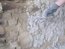 تطبيق الرش – الطبقة الأولى من الجص. تُسكب ملاط نصف سائل على الحائط بمجرفة (سمك طبقة يصل إلى 5 ملم) دون مزيد من التسوية ويتم تتبعها باستخدام ملعقة لتعزيز الالتصاق بالمادة الأولية.