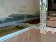 ثم ، باستخدام الثقب ، يجب عمل ثقوب في ملف تعريف الزاوية بخطوة 50 وعلى مسافة 5 سم من الحافة. يتم إرفاق ملف تعريف الزاوية بالجدران بمسامير ، وبعد ذلك يتم تحديد مواقع التعليق وملف تعريف الدليل. يتم تثبيت المعلقات على مسافة 40 سم من الحائط بخطوة 1.5 متر.