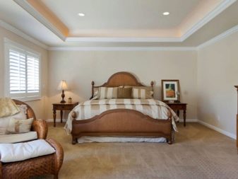 يمكن اختيار سقف من الجبس لغرفة النوم. الأشكال الهندسية البسيطة خيار جيد. هذا التصميم له تأثير مهدئ على الشخص..