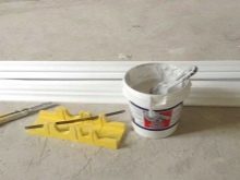 بعد ذلك ، يجب أن تتعامل بشكل مسؤول مع الخطوة التالية – إصلاح الرغيف الفرنسي أو التثبيت. ضع كمية معينة من المحلول الجاهز على الملعقة ، ضعه بالتساوي على طول الرغيف الفرنسي بالكامل ، على الأسطح التي ستكون على اتصال مباشر بالسقف والجدران. احرص على عدم تلطيخ الوجه بقطرات أو بقع من المعجون.