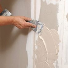 يتم العمل باستخدام معجون التشطيب عندما لا تتجاوز الشقوق 2 مم. يتم وضع الخليط النهائي على الجدران عن طريق الرش أو باستخدام ملعقة. قبل البدء في التسوية ، من الضروري تجهيز السطح. من أجل توزيع المعجون بالتساوي على القاعدة ، يوصى أولاً بإمساك الملعقة بزاوية 60 درجة ، ثم تقليل ميلها تدريجياً. من الضروري تغطية الجدران بالمعجون بضربات أفقية ورأسية. يجف معجون التشطيب في غضون 24 ساعة ، وبعد ذلك يمكن صنفرته ووضع مواد زخرفية فوقه على شكل دهان أو ورق حائط..