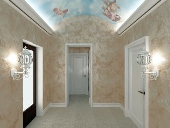 بالنسبة للرواق ، يمكنك استخدام نفس الجص المستخدم في القاعة. سيؤدي ذلك إلى توحيد الغرفة بطريقة أسلوبية وجعلها أكثر اتساعًا. للتشطيب ، يمكنك اختيار الأسطح الملساء والمزخرفة. سيكون الجمع بين الجص الفينيسي والأسطح الأخرى ناجحًا..