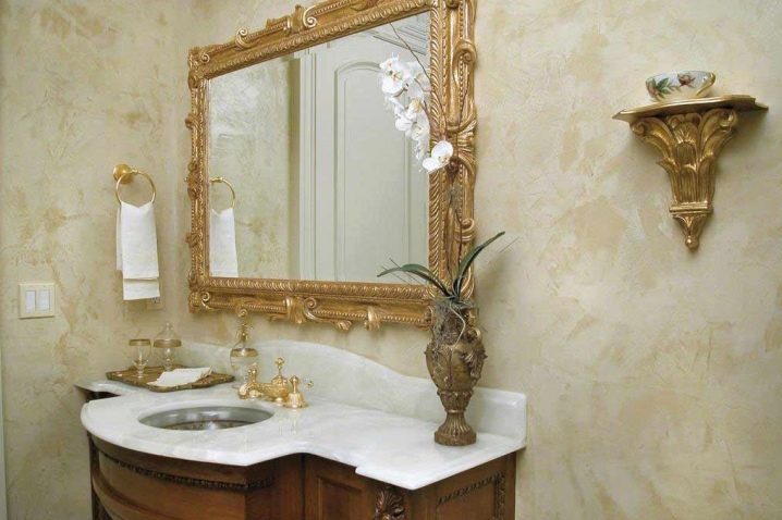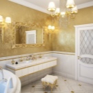 سيساعد الجص ذو الصبغات الذهبية في تحويل الحمام المألوف إلى بدوار فاخر. يجب عليك اختيار ظل فاتح ، على سبيل المثال ، رخامي. بصفتك “رفيقًا” للانعكاسات الذهبية ، يجب عليك اختيار الملحقات ذات الظل أو السباكة المماثلة “للذهب”.