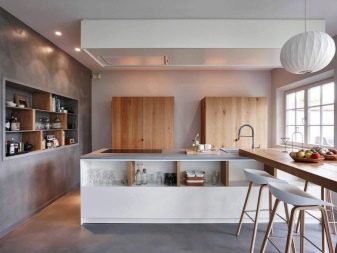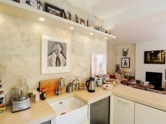 ينصح الخبراء بعدم استخدام ظلال مشرقة جدًا في المطابخ الصغيرة., لأنها تضيق الغرفة بصريًا وتبدو عدوانية. يبدو مزيج الجص الفينيسي مع البناء بالطوب أو الحجر أو سطح الخشب عضويًا.
