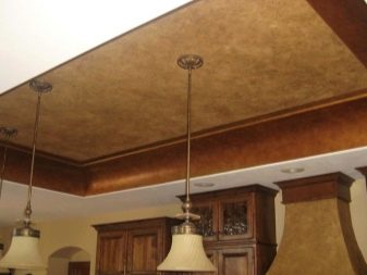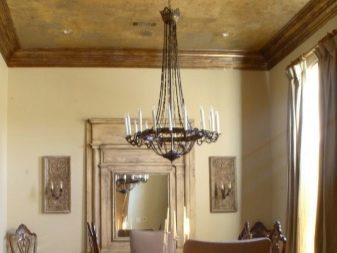 الجص الفينيسي على السقف جذاب بشكل خاص في غرف المعيشة الكبيرة والمكاتب ذات الطراز الكلاسيكي. من الأفضل استخدام تركيبة لامعة من ظلال الضوء ، والتي سترفع السقف أيضًا بصريًا.