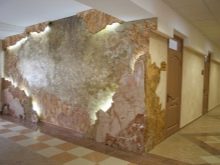 - جص رخامي. التكوين مشابه للمنتج السابق. يتم ضمان أصالة الملمس من خلال التطبيق بتقنية محددة ، والسطح النهائي يقلد بنية الحجر الطبيعي.