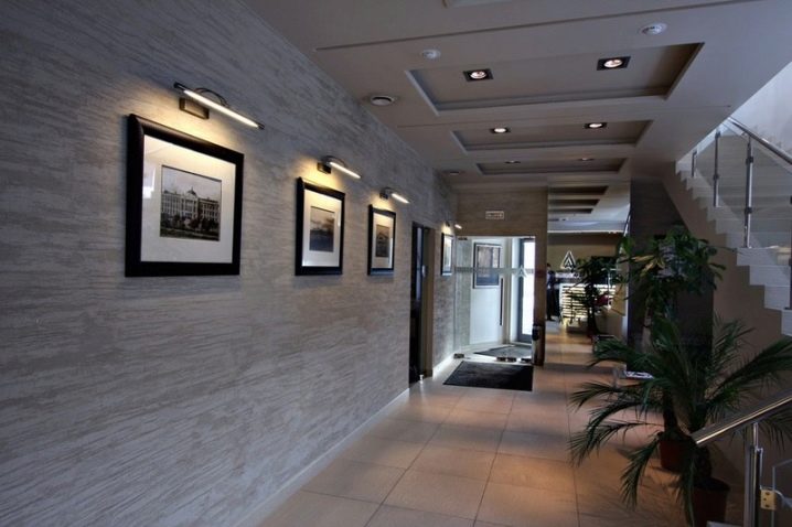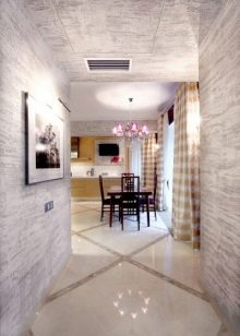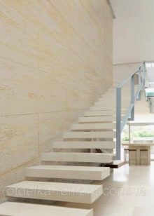 يمكن استخدام الجص ذو تأثير الحجر الجيري ليس فقط لتجديد الجدران ، ولكن أيضًا لتزيين بعض العناصر الداخلية. يتطابق الطلاء الزخرفي المطبق على الدرج تمامًا مع الدرابزين المعدني المصنوع من الحديد المطاوع.
