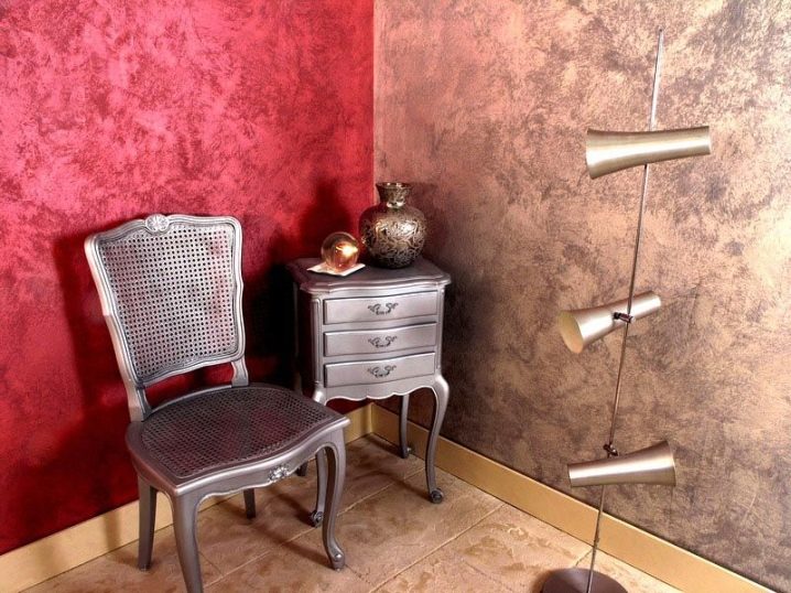 من الممكن طلاء الجدران المزخرفة بتأثير الجص الفينيسي. يتم تصنيع الطبقة الأساسية باستخدام طريقة الطلاء المعتادة ذات اللون الواحد.. الظل الثاني مأخوذ بلمعان معدني, على سبيل المثال ، على أساس مسحوق الفضة أو الألومنيوم.