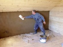 في هذه المرحلة ، تحتاج إلى إزالة جميع الاختلافات والمخالفات. يجب أن يتم العمل بالانتقال من أعلى الأرضية. مع هذا التطبيق ، لن يتلقى الخليط الموجود في الجزء السفلي من الجدران الخشبية رطوبة زائدة أثناء تدفق الماء. إذا كانت هناك شقوق صغيرة على الرذاذ المجفف ، فيمكنك التخلص منها باستخدام برايمر. يمكن أن يكون سمك طبقتها 7 مم.