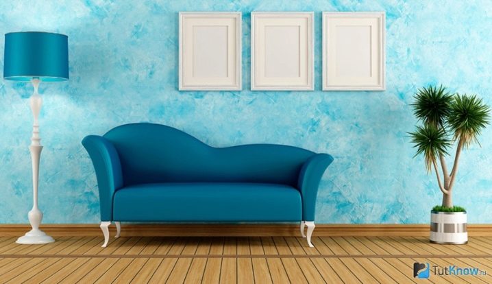 سيبدو جص الحرير الأزرق الفيروزي متناغمًا جنبًا إلى جنب مع أريكة زرقاء ذات ظهر متموج وأرجل بيضاء. من الأفضل إنهاء الأرضية في مثل هذه البيئة بالخشب. لإكمال المجموعة ، يجب تعليق لوحات بيضاء كبيرة فوق الأريكة ، ووضع مصباح أرضي بجانبه شمعدان أزرق وقاعدة بيضاء. يمكن تخفيف الدهانات الزرقاء والبيضاء بالنباتات الحية في الأواني الخفيفة.
