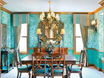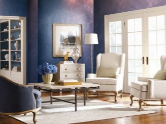 سيبدو جص الحرير الأزرق الفيروزي متناغمًا جنبًا إلى جنب مع أريكة زرقاء ذات ظهر متموج وأرجل بيضاء. من الأفضل إنهاء الأرضية في مثل هذه البيئة بالخشب. لإكمال المجموعة ، يجب تعليق لوحات بيضاء كبيرة فوق الأريكة ، ووضع مصباح أرضي بجانبه شمعدان أزرق وقاعدة بيضاء. يمكن تخفيف الدهانات الزرقاء والبيضاء بالنباتات الحية في الأواني الخفيفة.