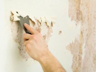 تحتاج في بعض الأحيان إلى إزالة التبييض الجديد بسرعة أو تطبيقه بشكل سيئ. إن أبسط وسيلة لإزالة مثل هذا الطلاء هي الأسطوانة والملعقة. انتباه: هذا النوع من العمل ينطوي في البداية على إصلاح شامل ، ودائمًا ما يكون هناك الكثير من الأوساخ والحطام. بالإضافة إلى حماية الأثاث ، يقومون أيضًا بتغطية الأرضية بالصحف. يتم نقع السطح بإسفنجة وتقشير الطبقة المتأخرة باستخدام ملعقة.