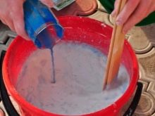لتحضير محلول من الجير ، تحتاج إلى 2.5 كجم من المواد. يتم تخفيف الجير مبدئيًا باستخدام لتر من الماء الدافئ. ثم يضاف إليها 100 جرام من الملح ، والتي يجب نقعها أولاً في القليل من الماء. بعد ذلك ، يجب إضافة القليل من اللون الأزرق وفقًا لمبدأ عمل حل من الطباشير. في المرحلة النهائية ، يضاف 10 لترات من الماء إلى الخليط الناتج..