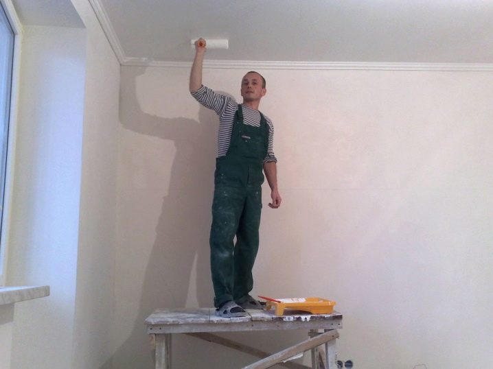 يوصى بتقسيم السقف إلى شرائح منفصلة ، بحيث يتم تطبيق طبقات التبييض. يتم إجراء التداخلات عند مفاصل الشرائط. ستمنع هذه التقنية ظهور الأماكن غير المصبوغة..
