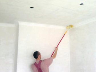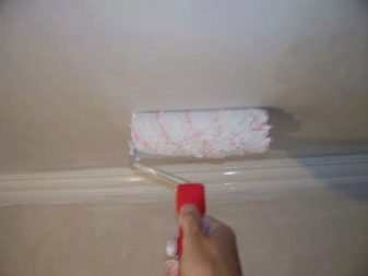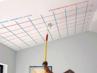يوصى بتقسيم السقف إلى شرائح منفصلة ، بحيث يتم تطبيق طبقات التبييض. يتم إجراء التداخلات عند مفاصل الشرائط. ستمنع هذه التقنية ظهور الأماكن غير المصبوغة..