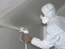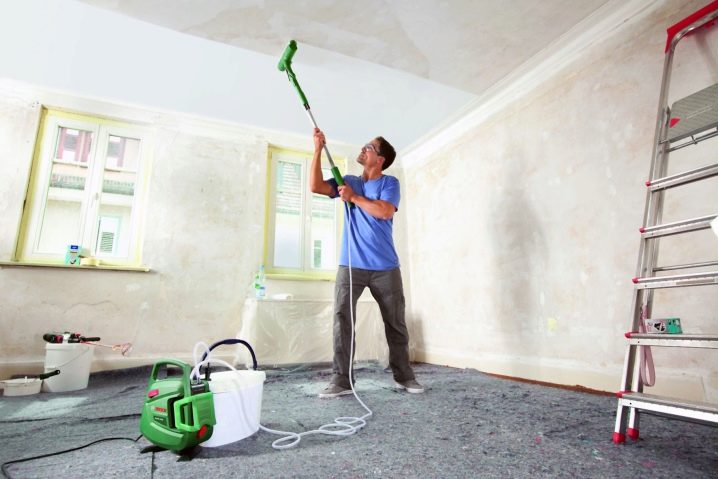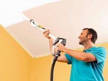 في أغلب الأحيان ، أثناء إصلاحات المنزل ، يتم تبييض الأسقف باستخدام الفرشاة أو الأسطوانة. يمكنك أيضًا استخدام مسدس رش أو مكنسة كهربائية خاصة لهذه الأغراض. ولكن في الوقت نفسه ، لن يستقر الطلاء على سطح السقف فحسب ، بل على الجدران والأرضية أيضًا. لذلك يوصى بتغطية جميع أسطح الغرفة ما عدا السقف..