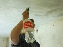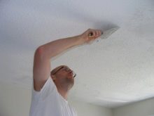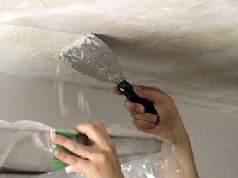 إذا كان الطلاء القديم يتكون من الجير ، فسيكون من الصعب إزالته. للقيام بذلك ، تحتاج أولاً إلى تبليل سطح السقف حتى ينعم الجير. لهذا ، يوصى باستخدام زجاجة رذاذ. ثم تتم إزالة طبقات النهاية القديمة بملعقة. في نهاية العمل يوصى بشطف سطح السقف بخرقة لإزالة ما تبقى من الجير والغبار..