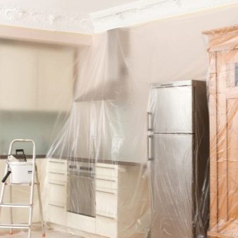 قبل البدء في العمل ، يوصى بإزالة العناصر الداخلية والأثاث من الغرفة. يجب تغطية الأشياء الكبيرة والأسطح الأخرى بشيء حتى لا تتسخ أثناء عملية التبييض. إذا كان هناك بلاط على الجدران ، فلن تحتاج إلى تغطيتها. في نهاية العمل يمكن غسلها بسهولة من الأوساخ..