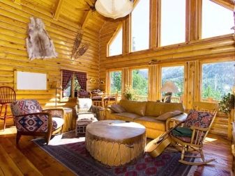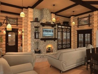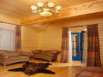 يمكن تزيين الجدران في غرفة المعيشة بمنزل مبني من أي ظلال. يتطلب الطراز الحديث استخدام أكثر الألوان غير العادية. إذا كان الملاك من عشاق الشدة والأناقة ، فيمكنك غمد الجدران والسقف والأثاث مع منزل كتلة بظلال داكنة. في هذه الحالة ، يجب أن يكون الأثاث ضخمًا ومريحًا ومزينًا لتتناسب مع الجدران والسقف. لا تستخدم الألوان الزاهية أبدًا. يتم الحصول على راحة منزلية خاصة إذا كان هناك مدفأة في غرفة الضيوف. يخلق الخشب المتكسر والإضاءة الخافتة جوًا رومانسيًا في الغرفة.