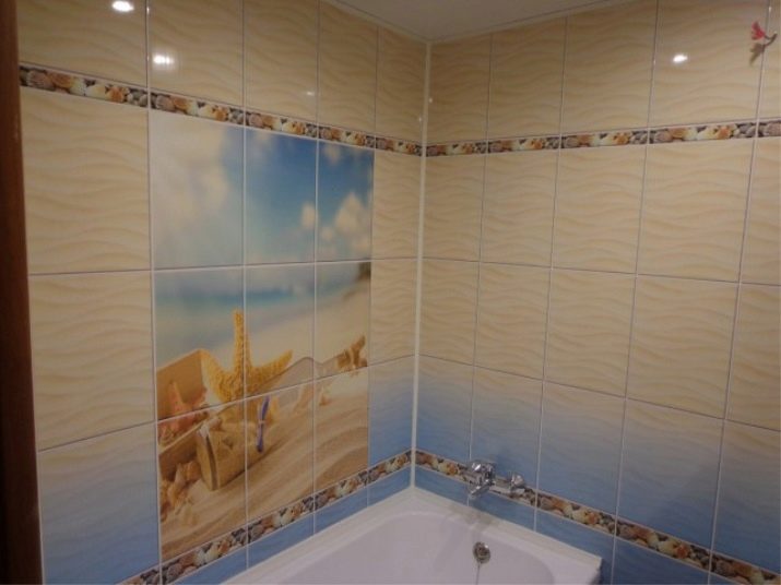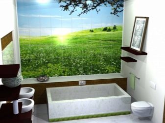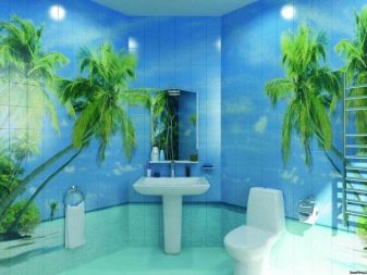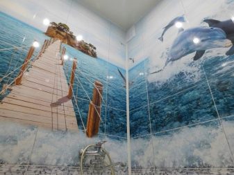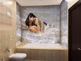 بفضل طرق طباعة الصور الحديثة ، أصبح من الممكن أيضًا وضع في الحمام ليس فقط المناظر الطبيعية لأماكنك المفضلة ، ولكن أيضًا الصور العائلية. للتأكيد على هذا التصميم ، من الضروري تزيين الغرفة بعناصر معدنية وزجاجية. على العكس من ذلك ، إذا كنت ترغب في الحصول على حمام مريح ولكن متواضع ، فأنت بحاجة إلى اختيار بلاستيك بلون الباستيل للكسوة ، ولست بحاجة إلى شراء أثاث باهظ الثمن له ، وسيتم تزيين الجزء الداخلي بشكل ممتع بأباريق سيراميك و أنماط الزهور. سيضيف السقف المبطن بألواح متشابهة جاذبية لهذه الغرفة ، بينما يُنصح بالتركيب من الألواح المضلعة مع إدراج المرآة.