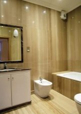 بالنسبة للغرف التي يسود فيها الطراز العرقي ، قم بإنهاء مواد تقليد الخشب.. في مقابلهم ، يخلق الأثاث الخشبي والستائر القطنية بزهرة صغيرة جوًا مريحًا. لكن لا ينصح بهذا الديكور لكابينة الاستحمام ، حيث ستبدو في غير مكانها. تعتبر الكسوة البلاستيكية بالرخام المقلد فكرة جريئة أيضًا. إنه يحل محل السيراميك بشكل مثالي ، وسيزيد النسيج الجميل من التأكيد على الطبيعة الطبيعية للداخل..