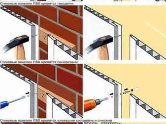 من غير المناسب استخدام أدوات التثبيت اللاصقة إذا كان معروفًا على وجه اليقين أنه سيكون من الضروري في المستقبل إزالة الألواح البلاستيكية. وتظهر الحاجة إلى ذلك فجأة ، لذا يجب أن تفكر بالتأكيد في تثبيت الإطار. لإرفاق الكسوة بمقاطع معدنية ، يوصى باستخدام براغي ذاتية التنصت مع غسالات الضغط. يتم تصحيح تفاوت الجدار الخرساني بوضع كتلة بالسماكة المطلوبة. في الردهة ، يمكنك استخدام الألواح البلاستيكية دون أدنى شك ، ما عليك سوى تحديدها بعناية.