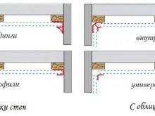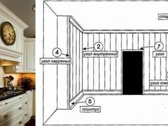 بدلاً من ذلك ، يستخدمون زوايا بلاستيكية بدون أخاديد. يتم لصق هذه المنتجات بسيليكون شفاف ، وفركها بقطعة قماش مبللة تزيل الخليط الزائد. يمكن أن يصل الإدخال ، حسب شدة الزاوية ، من 2 إلى 5 سم ، ويتم قطع الأماكن التي يجب تركيب مأخذ التيار الكهربائي فيها. قطع التيار الكهربائي مقدمًا ؛ يتم الانتهاء من التثبيت عن طريق وضع الألواح عند المفاصل مع الأرضية والسقف ، والتي يتم تثبيتها بمسامير ذاتية التنصت.