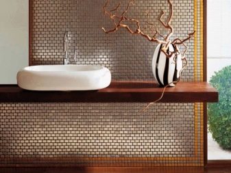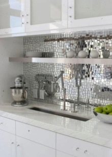 - بلاط المرآة (أحد خيارات الزجاج) يُستخدم كخلفية فقط. نظرًا لقدرته على الانعكاس ، فإنه يعطي تغييرًا بصريًا في نسب الغرفة. له عدد من العيوب المهمة: الهشاشة ، وقابلية عالية للتشوه وعدم تحمل الرطوبة المستمرة.