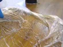 - يمكن تحسين التأثير بضغط. ضع غلاف بلاستيكي على القاعدة المعالجة. ثم عليك الانتظار بضع ساعات. في هذه الحالة ، قد تبدأ طبقة الطلاء في “الانتفاخ” ، وقد يصبح لون الغسل بنيًا أو بنيًا داكنًا.