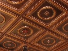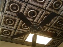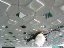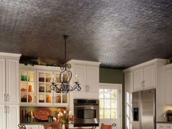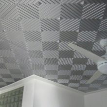 وتجدر الإشارة بشكل خاص في المناطق الداخلية الحديثة إلى زخرفة السقف ببلاط رغوي بسطح مصفح. تبدو مشرقة وأنيقة ، وتتيح لك تزيين الغرفة بطريقة أصلية لإضفاء مظهر غير عادي عليها. نظرًا لأن ألواح السقف من هذا النوع مزينة بأنماط جميلة ، فيمكن استخدامها بأمان في التصميمات الكلاسيكية. البلاط ذو الأنماط ثلاثية الأبعاد مناسب تمامًا للديكورات الداخلية للغرف التي تسود فيها تفاصيل طراز عصر النهضة. من أجل أن يتناسب هذا السقف بشكل متناغم مع أسلوب التصميم العام ، يجب استكماله بأثاث جميل وديكور رائع للجدار..