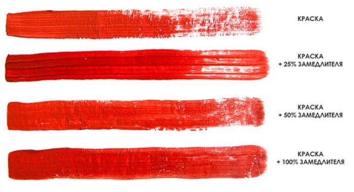 عند ترقق لون الأكريليك بالماء ، فإن النغمة الأصلية مشوهة بشكل كبير., ويصبح تناسق اللون مائيًا وغير ملائم للتطبيق. المثبط لا يشوه اللون الأصلي. عند تطبيقه ، لا يتغير الظل ولا يتلاشى. في كثير من الأحيان ، يكتسب اللون ، على العكس من ذلك ، نسيجًا أفضل ويصبح أكثر إشراقًا.. لذلك ، غالبًا ما يتم استخدام تركيبة متباطئة من أجل تحقيق تأثير مرئي معين عند الرسم..