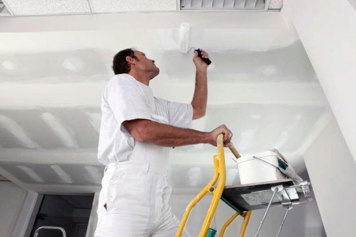 يمكن طلاء بلاط السقف بالبوليسترين الممتد قبل وبعد التركيب. في الحالة الأولى ، سيسمح لك ذلك برسم عناصر فردية على سطح أبيض ، وفي الحالة الثانية – لف قماش التشطيب النهائي بأسطوانة من الفرو.